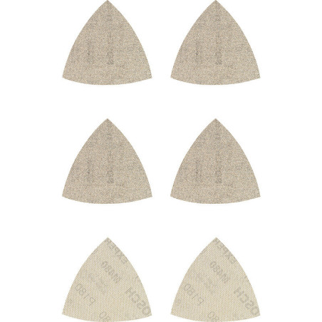 Grain : 80/120/180 - Conditionnement : 15 emballages de 6 abrasifs - Nombre de trous : maillage ouvert - Diamètre (millimètre (mm)) : 93x93 - Unité de vente : (1 ensemble) •