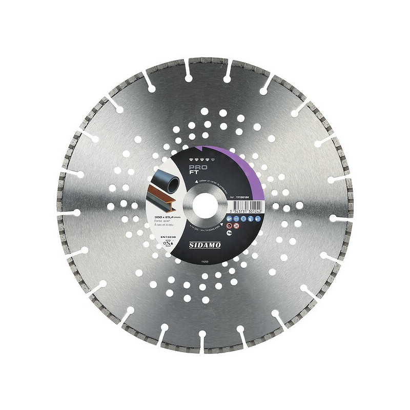 Modèle : Pro FT - Outils : Tronçonneuse, scie sur table, scie de sol thermique - Nombre de tours maxi par minute : 6400 - Descriptif : Segments soudés laser. Centre acier ventilé - Utilisation intensive : Fonte, acier - Diamètre (mm) : 300 - Épaisseur (mm) : 2.80 - Hauteur de segment (mm) : 5 - Unité de vente : (1 pièce) •