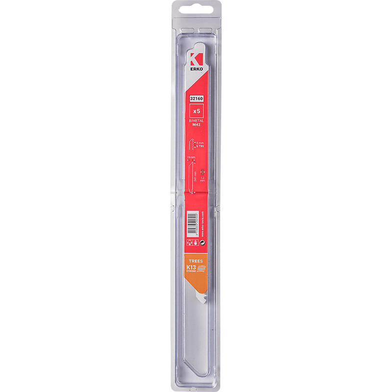 Lame : Bimétal HSS M42 - Coupe : Intense/Démolition - Modèle : TREES - Denture : 5 TPI - Matériaux à couper : Bois, bois vert - Pas (mm) : 5 - Longueur de la lame (mm) : 241 - Unité de vente : (1 boîte) •