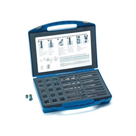 La gamme : Pose de filet rapporté "Hélicoil plus". Système complet permettant de réparer un taraudage abîmé par la mise en place d'un filet rapporté. Pose en 3 temps : percer, tarauder, poser le nouveau filet. Le coffret comprend les forets, les tarauds, le filets rapportés et tous les autres accessoires de pose. •