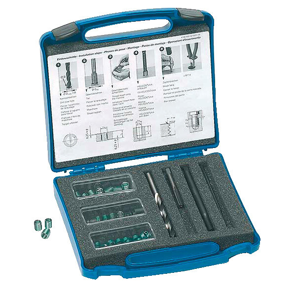La gamme : Pose de filet rapporté "Hélicoil plus". Système complet permettant de réparer un taraudage abîmé par la mise en place d'un filet rapporté. Pose en 3 temps : percer, tarauder, poser le nouveau filet. Le coffret comprend les forets, les tarauds, le filets rapportés et tous les autres accessoires de pose. •