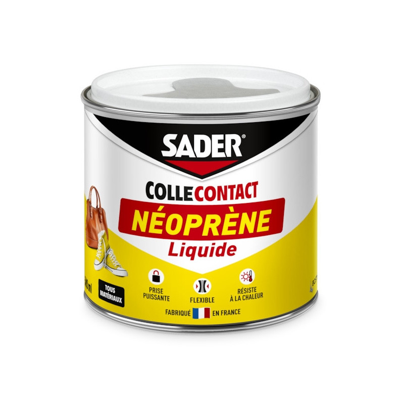 Colle contact à prise immédiate et définitive. Haute résistance à l'arrachement. Convient pour la plupart des matériaux : bois et stratifiés (baguettes. placages sur bois et plans de travail...). caoutchouc (nez de marche. dalles de sol...). liège (revêtements muraux. dalles...). plastique rigide (gaines et plinthes électriques. revêtements de sols...). métal (doublage de portes. habillage de tôles...). Ne convient pas pour le polyéthylène (PE). le polypropylène(PP) et le polystyrène expansé ou extrudé. Assemblage de plastiques en surfaces planes uniquement. Résiste à la chaleur (+110°c) et à l'humidité.