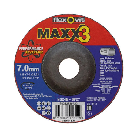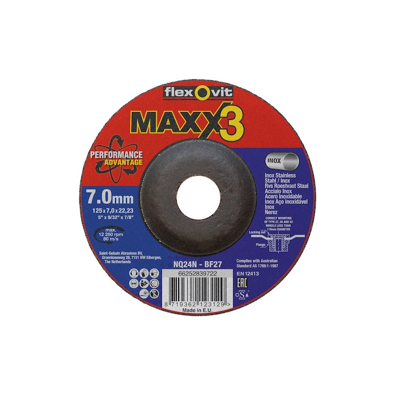 FLEXOVIT MAXX3 Travaillez plus efficacement grâce aux meules d’ébarbage Flexovit Maxx3. Notre engagement en faveur de l’amélioration de la performance industrielle n’a jamais été aussi fort grâce à cette association de grain céramique et de système de liant qui offre des résultats d’ébarbage exceptionnels. Maxx3 offre une puissance remarquable et un contrôle optimal du début à la fin. même utilisée sur toutes les faces. pour les applications sur les aciers les plus durs. avec un confort d’utilisation optimal. Permet d’éliminer les traces de soudure sur les surfaces métalliques planes et dans les angles de 30 à 45degrés avec un nombre de meules réduit.