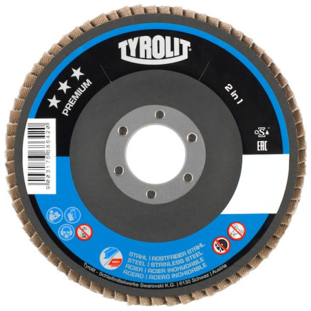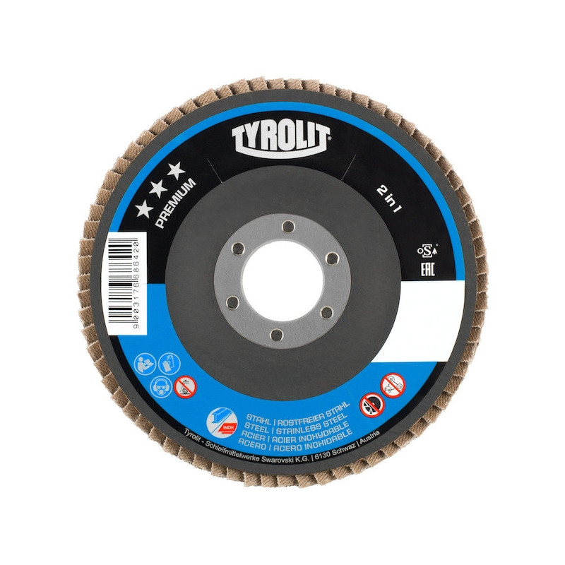 Le disque à lamelles PREMIUM 2in1 est conçu pour une utilisation universelle sur l'acier et l'acier inoxydable. offrant des résultats optimaux sur ces matériaux. Disponible dans une large gamme de diamètres et de grains. il convient à diverses applications. du meulage des cordons de soudure aux arêtes et surfaces. Grâce à sa grande longévité et à son rendement élevé. ce disque est idéal pour travailler aussi bien les aciers fortement alliés que les aciers non ou faiblement alliés. particulièrement lorsqu'il est utilisé avec des meuleuses d'angle puissantes.