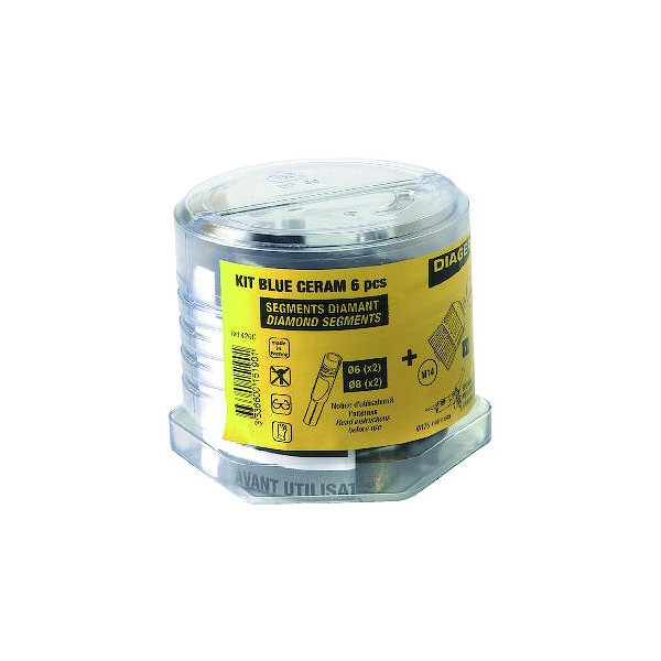 Composition : Blue Ceramdiamètre 6 - 6 - 8 - 8 + 1 Pierre à aviver + 1 Mandrin pour meuleuse. Permet de percer les revêtements durs ou délicats utilisés dans les salles de bains et cuisines avant mise en place d'éléments de fixation. Perçage à sec. Recommandé pour les perçages des matériaux durs (gré-céram. céramiques...) Gorge d'extraction. Tête segment : haute teneur en diamant.Coffret