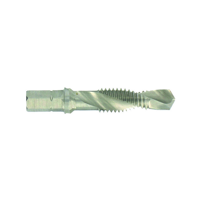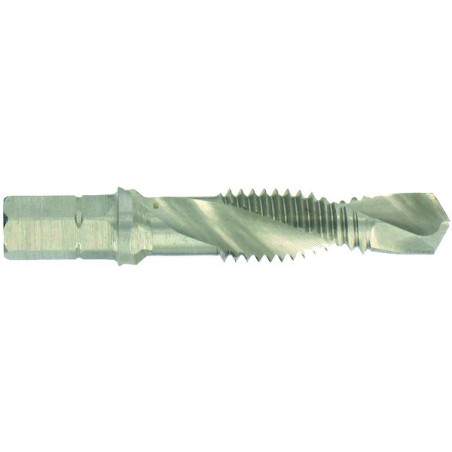 Foret taraudeur à queue hexagonale 6.35 mm.HSS non revêtu.Pour tôles et acier < 70 DaN/mm².Percer. tarauder et ébavurer en une seule opération.Utilisation en 1 étape. à faible vitesse de rotation.