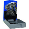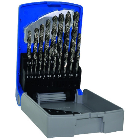 Coffret de 19 Forets taillés meulés de 1 à 10 mm par 0.5 mm.Matière: acier rapide HSS. Revêtement: non. Affûtage en croix. Foret pour le perçage des aciers et des aluminiums grâce à son affûtage autocentrant.