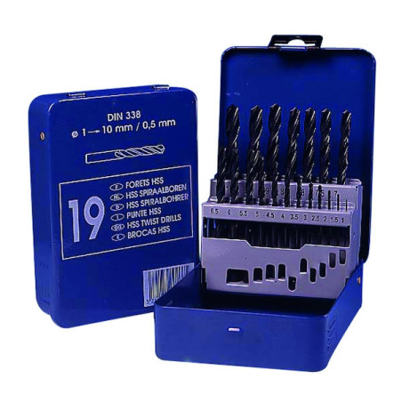 Coffret de 19 Forets de 1 à 10 mm par 0.5 mmMatière: HSS laminéRevêtement: Steampour acier. Usage occasionnel