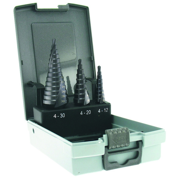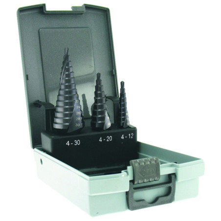 Coffret de 3 forets Ø 4-12. 4-20 et 4-30 mm Pour des perçages rapides dans les tôles d'acier résistantes et les plastiques. Grande durée de vie. Goujures hélicoïdales. affûtage pointe en croix autocentrant.
