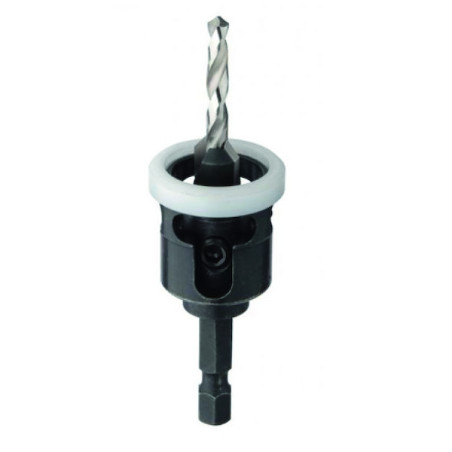 Outil permettant de réaliser en une opération un avant trou et le fraisage pour loger la tête de vis. La butée de profondeur est réglable et la bague plastique évite de marquer les lames de terrasse. Ce système garantit un perçage et fraisage constant à la même profondeur.Le kit contient 3 foretsdiamètre4 ou 4.5 mm. un fraisoir 45°. plaquettes carbure. une butée de profondeur « basse friction ». une clé hexa double.
