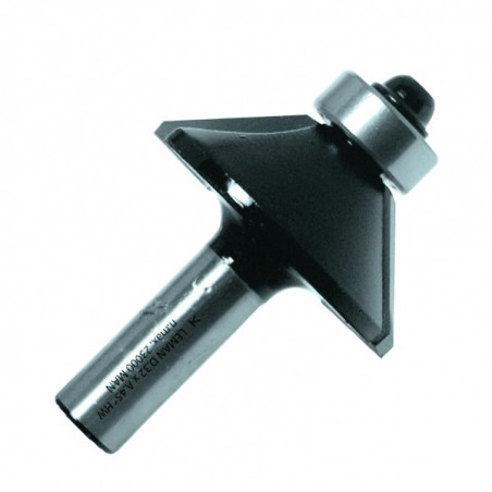 Mèche d’affleureuse à chanfreiner carbure 2 coupes avec guide à billes. Permet de chanfreiner des chants en suivant un gabarit.