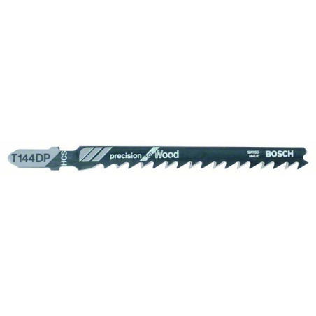 Lame de scie sauteuse 100mm HCS - T 144 DP Precision for Wood (lot de 5 pièces).Configuration de la denture : avoyé. rectifié.Domaines d'utilisation : Bois tendre. panneaux de particules. panneaux lattés. panneaux de fibres (5 - 50 mm). portes. plans de travail (< 50 mm).