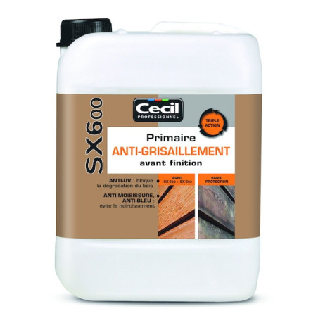Primaire anti-UV conçu contre le grisaillement des bois extérieurs.Nettoie. dégrise et ravive les bois tachés et noircis par le soleil et les intempéries sans décolorer. Ses agents antioxydants. ralentissent le grisaillement du bois par les UV. Formulé en phase aqueuse pour un confort d’application inégalé. il ne modifie pas l’aspect du bois et diminue fortement la fréquence d’entretien du saturateur. S’utilise sur toutes les essences de bois résineux. feuillus ou tropicaux (Mélèze.Red cedar. Douglas) en extérieur. Le primaire SX600 est l’étape indispensable avant saturateur pour éviter le grisaillement et le vieillissement prématuré des bois extérieurs. Il permet de diminuer fortement la fréquence d’entretien du saturateur. Rendement : 5 m²/L en é couches.