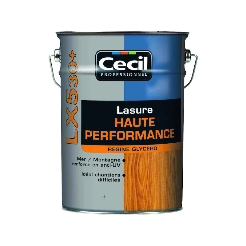 Excellente accroche sur tous type de supports et toutes anciennes finitions : idéale en rénovation.La lasure LX530+ est spécialement étudiée pour décorer et protéger tous les bois extérieurs.Elle permet d’obtenir une protection élevée sur tous types de bois (bardages. chalets.ports. volets. fenêtres. charpentes.…). en rénovation et sur bois neufs.Sa formule gélifiée permet une application sans coulure. sans trace de reprise.Elle permet d’obtenir une protection élevée sur tous types de bois (bardages. chalets.ports. volets. fenêtres. charpentes.…). en rénovation et sur bois neufs.Nettoyage au White spirit.
