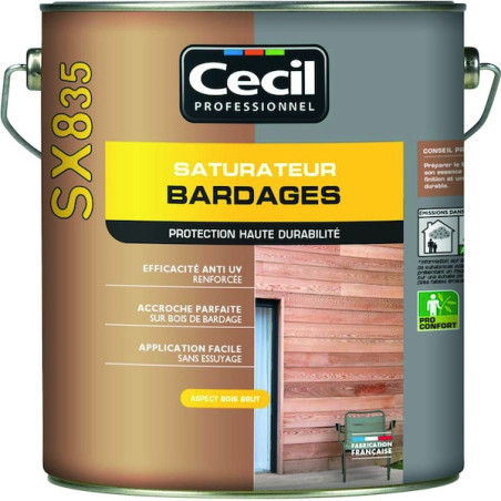 SX835 est un saturateur destiné à tous les bois verticaux extérieurs et intérieurs: bardage. brisesvues. abris de jardin. volets. lambris… Il offre une accroche parfaite sur les essences de bois utilisées en extérieur : bois exotiques. feuillus. résineux. bois autoclavés. bois de bardage… Sa formule renforcée en anti-UV assure une protection très longue durée contre UV et intempéries même en conditions extrêmes (mer/montagne). Le bois est protégé contre le grisaillement et le fendillement. Sa texture anti-goutte permet une application facile sans coulures même en vertical et une excellente glisse sous le pinceau. Son application sans essuyage et son séchage rapidepermettent d’optimiser le temps de chantier. Il ne s’écaille pas pour un entretien facile par simple ré-application.