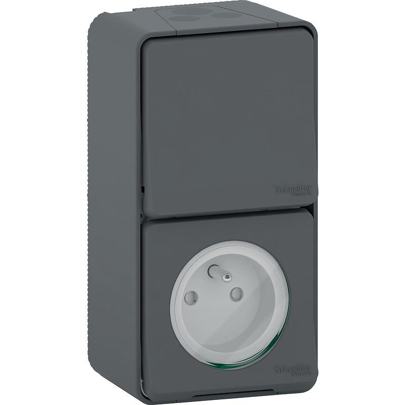 Finition : Gris - Catégorie : Prise de courant fort - Série : Mureva Styl - Désignation : Va-et-vient 10A + prise 2P+T 16 A - Type de pose : Saillie - Unité de vente : (1 pièce) •