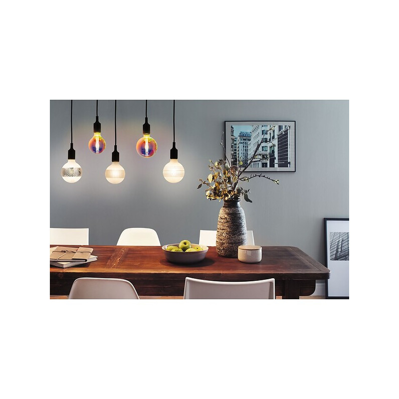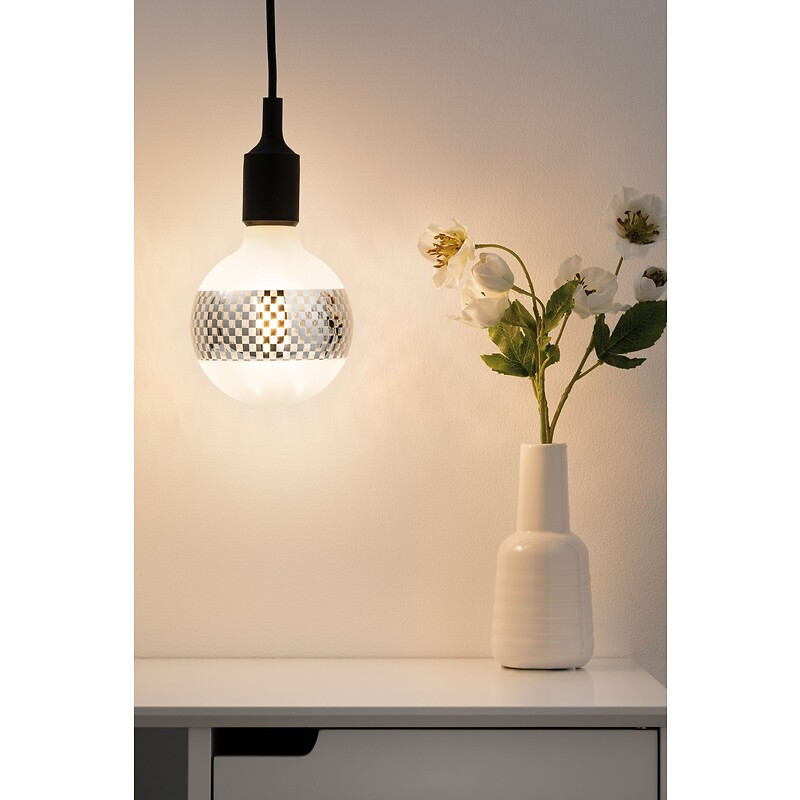 Finition : Argent - Culot : E27 - Forme : Globe - Gradable : Oui - Type de source : LED - Classe énergétique : F - Modèle : Quadrillé - Flux (lm) : 420 - Diamètre (mm) : 125 - Faisceau (°) : 360 - Puissance (W) : 4.50 - Durée de vie moyenne (h) : 15000 - Température de couleur (°K) : 2600 - Unité de vente : (1 pièce) •