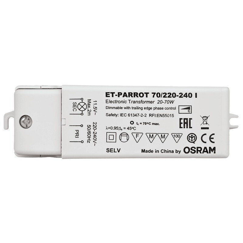IP : 20 - Catégorie : Transformateur - Longueur (mm) : 128 - Puissance (W) : 20 - Hauteur (mm) : 31 - Largeur (mm) : 38 - Tension (volt (V)) : 220 - 240 - Unité de vente : (1 pièce) •