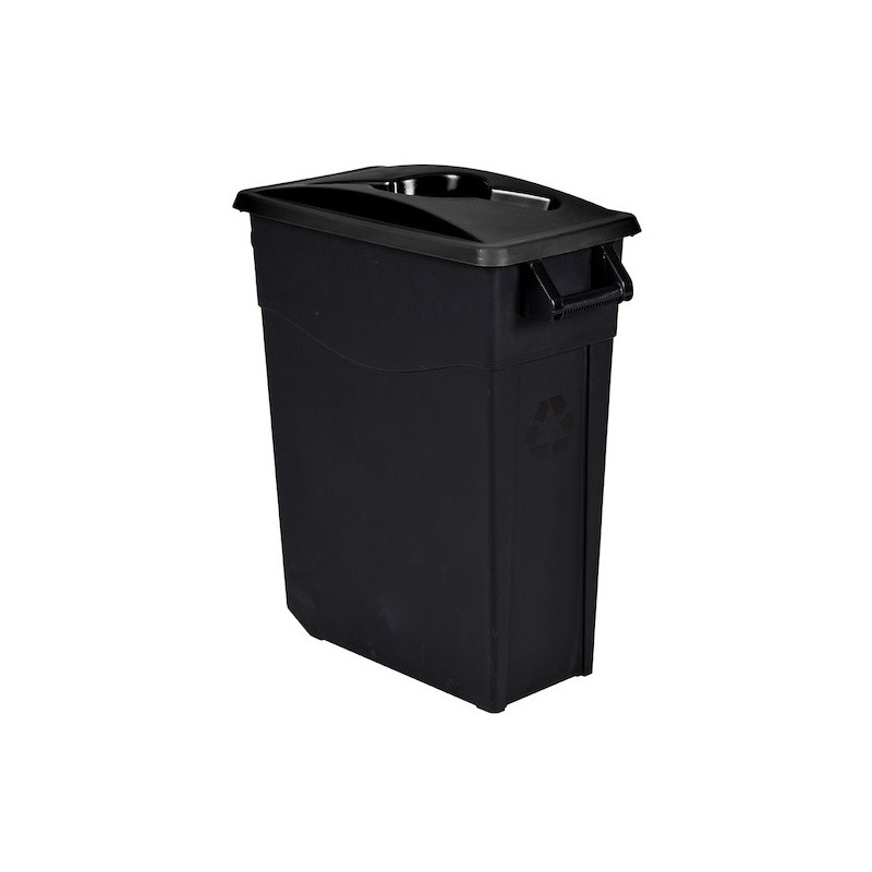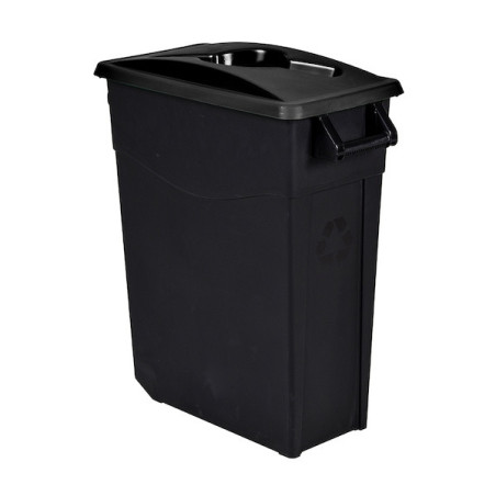 Adapté aux espaces intérieurs.Polypropylène recyclé.Roues lisses et poignée de transport. Couvercle rabattable à ouverture calibrée.
