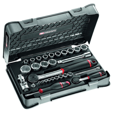 Ce coffret mixte de 30 pièces avec cliquet et douilles 1/4" et 1/2" contient :Composition mixte “RADIO” L 1/4” :9 douilles : R. 5.5 - 6 - 7 - 8 - 9 - 10 - 11 - 12 - 13 mm.Cliquet tête ronde R.161B.1 rallonge de longueur 100 mm R.210.Cardan universel R.240A.Poignée 1/4" R.236A.Composition mixte “STANDARD” L 1/2” :14 douilles : SH. 10 - 11 - 12 - 13 - 14 - 15 - 16 - 17 - 18 - 19 - 21 - 22 - 24 - 27 mm.Cliquet tête ronde S.161B.1 rallonge de longueur 130 mm S.210.1 cardan S.240A.