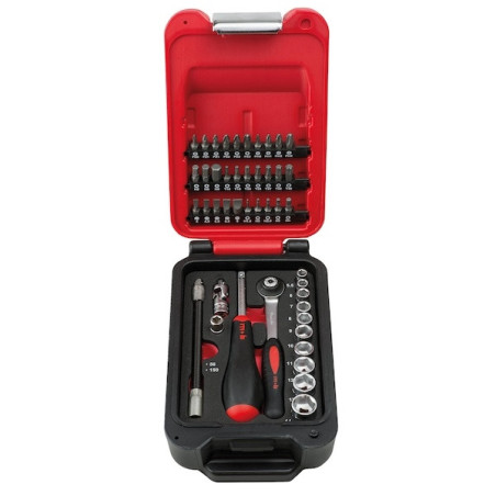 Coffret complet 1/4" et vissage : Cliquet Premium 72 dents 10 douilles poignée tournevis 30 embouts de vissage rallonges dont une flexible exclusiveEn Polyéthylène Haute Densité (PEHD). ne s’abîment pas aux chocs comme des coffrets métalliques. qu’il est nécessaire de débosselerFermoirs métalliquesMousse bicolore pour un repérage facile des manquantsDimensions : 135x215x60 mm