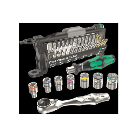 Ce jeu compact Tool Check PLUS de douilles et d'embouts de vissage1/4" torsion durs particulièrement adaptés pour les vissages dans des matériaux durs. est livré avec un tournevis Interchangeable.Composition :1 Manche porte-embouts Kraftform.1 porte-embouts Rapidaptor.1 adaptateur 1/4".1 mini-cliquet à embout en acier forgé.7 douilles de diamètres 5.5 - 6 - 7 - 8 - 10 - 12 - 13 mm.28 emboutsde vissage avec les empreintes :Phillips® : 2 x PH1 - 3 x PH2 - 1 x PH3.Pozidriv® : 1 x PZ1 - 3 x PZ2 - 1 x PZ3.Torx® : T10 - T15 - T20 - T25 - T30 – T40.Torx® percé (inviolable) : T10 - T15 - T20 - T25 - T30.6 Pans creux : 3 - 4 - 5 - 6 - 8 mm.Plat : 5.5 mm.