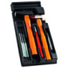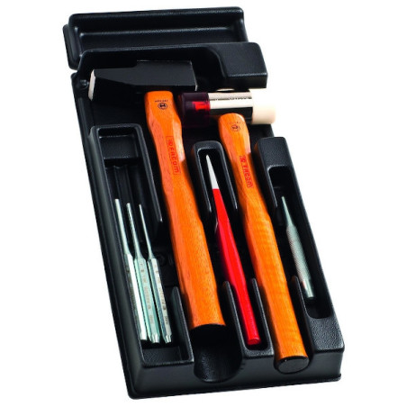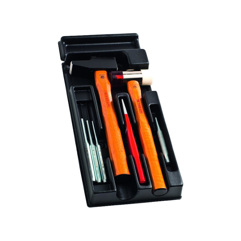 Comprenant : - 200H.32 : Marteau rivoir Hickory 32 mm. - 208A.32CBA : Massette acier 32 mm. - 263.20 : Burin. - 256.6 : Pointeau. - 248.4 - 5 - 6 mm : Chasses-goupilles longs. - Plateau thermoformé PL.333.