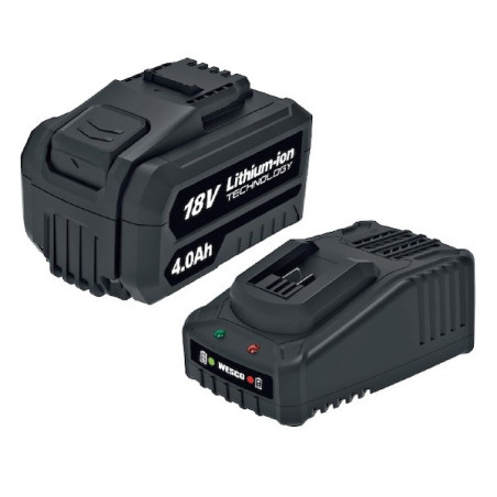 Le pack NRJ WESCO WS1102 comprend un chargeur rapide de 2 Ah avec fixation murale pour un gain de place. ainsi qu'une batterie 18V de 4 Ah offrant une grande autonomie.