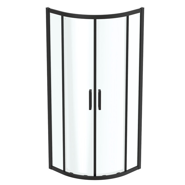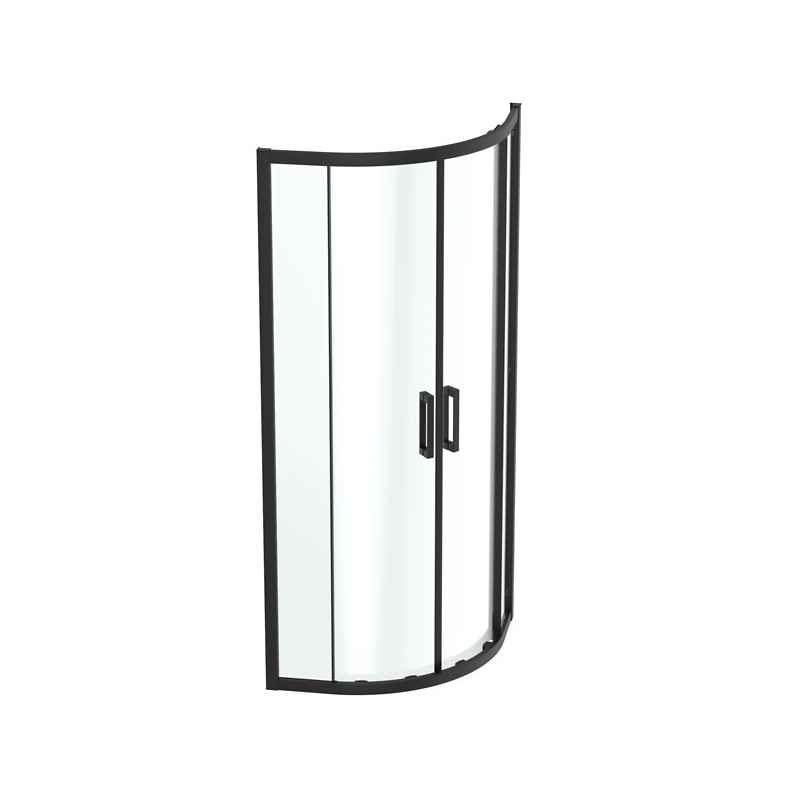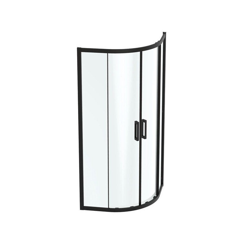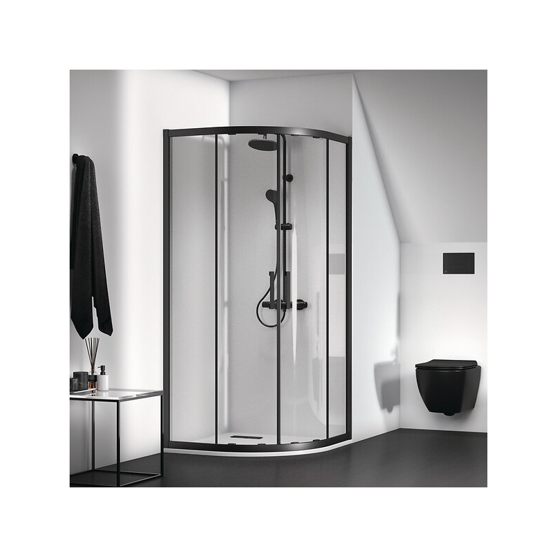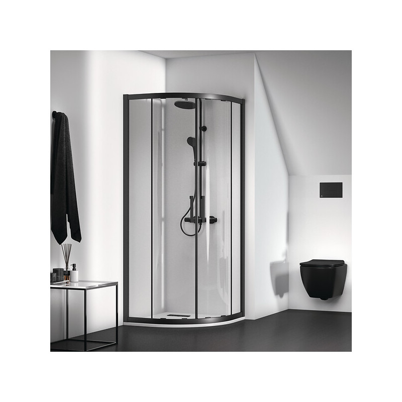 Finition : Noir mat - Catégorie : Parois de douche - Accès : D'angle - Vitrage : Transparent - Type d'ouverture : Coulissant - Format de receveur : 1/4 de rond - Unité de vente : (1 pièce) •