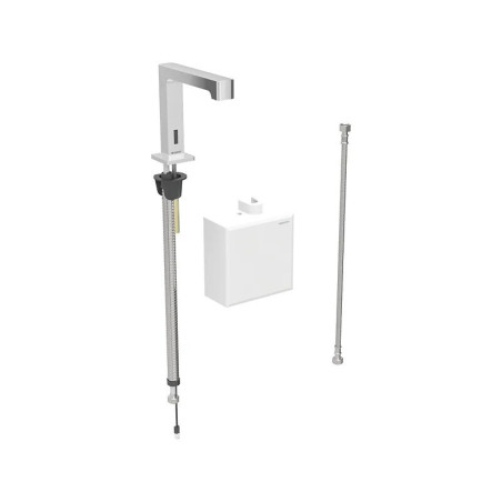 Robinetterie de lavabo avec détecteur infrarouge et flexible de raccordement. Module fonctionnel apparent à commande électronique, module fonctionnel et accumulateur pour alimentation par générateur. Flexibles à tresse métallique 3/8". Clé de verrouillage du mousseur. Matériel de fixation. •
