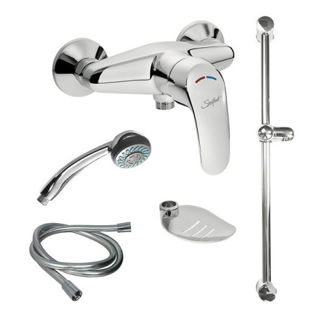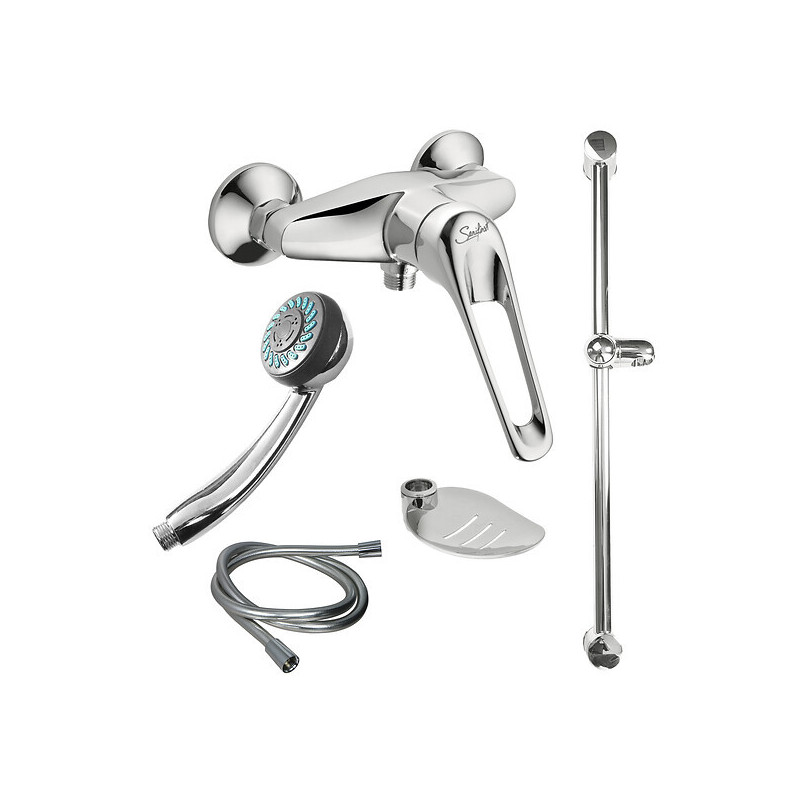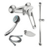 Livré avec rosaces et raccords excentrés M G’1/2 et douchette 2 jets chromée picot anticalcaire. flexible métaloplastique 1,5m, et une barre diamètre 25 lg 600 mm. •
