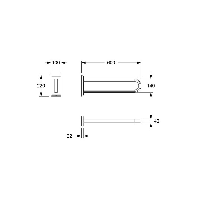 Série : Cavere Care - Catégorie : Barre d'appui - Type de barre : Barre murale - Hauteur (mm) : 100 - Largeur (mm) : 220 - Longueur (mm) : 600 - Unité de vente : (1 pièce) •