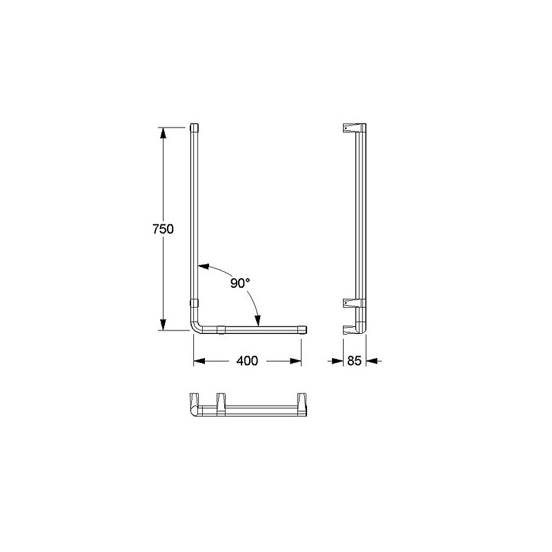 Série : Cavere Care - Catégorie : Barre d'appui - Type de barre : Coudé 90 - Installation : Résidentiel et hôtellerie - Dimensions (millimètre (mm)) : 750 x 400 - Unité de vente : (1 pièce) •