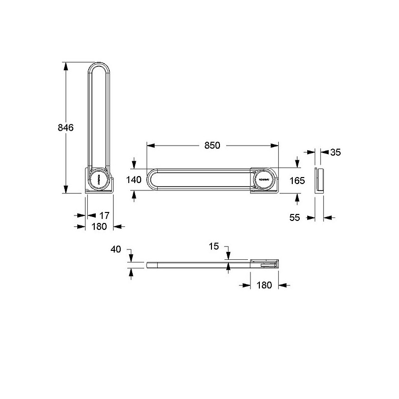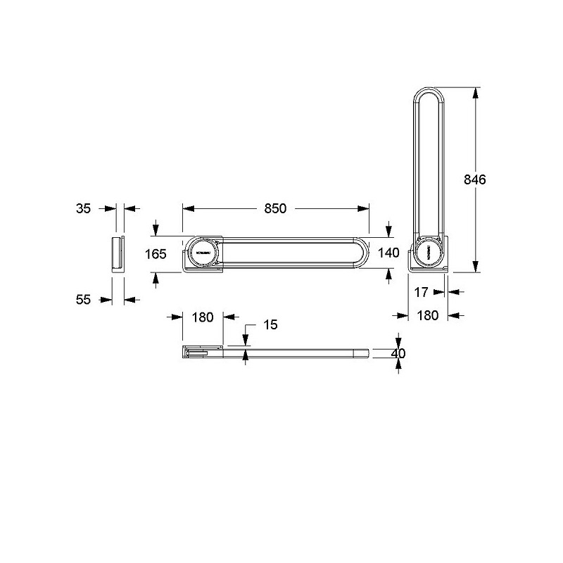 Série : Cavere Care - Catégorie : Barre d'appui - Type de barre : Barre rabattable fixation latérale - Hauteur (mm) : 165 - Longueur (mm) : 850 - Largeur (mm) : 55 - Unité de vente : (1 pièce) •