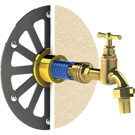 Matière : Laiton - Finition : Brut - Entrée : F15x21 - Sortie : F 15x21 - Catégorie : Applique pour robinet d'arrosage - Unité de vente : (1 pièce) •