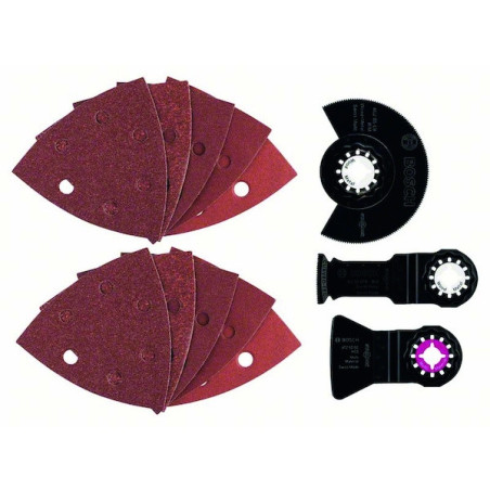 Le set contient : - 1 lame segment 85 mm bois et métal - 1 lame plongeante 32 mm bois et métal - 1 spatule flexible 52 mm en métal - 10 abrasifs bois/peinture