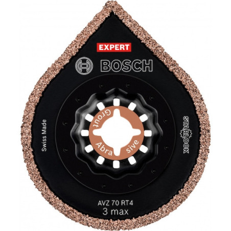Pouvoir retirer un carreau endommagé sans avoir à refaire tout le mur est l'un des grands avantages de l'outil multifonction Starlock. et la lame EXPERT 3 max facilite encore plus la tâche. Grâce à cette lame ingénieuse. vous pouvez retirer des joints. atteindre les coins les plus étroits et poncer le mortier.C'est la lame pour outil multifonction oscillant dont vous avez besoin pour le carrelage : une conception d'une simplicité trompeuse. qui facilite votre travail et garantit une efficacité maximale. Avec la lame pour outils multifonctions Bosch EXPERT 3 max AVZ 70 RT4. vous avez l'assurance de toujours disposer du bon accessoire Starlock.