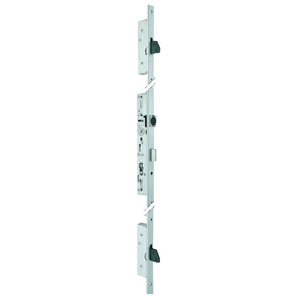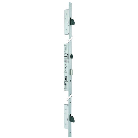 Coffre 3 points pour porte métallique. dispose d'un entraînement à engrenages.Têtière acier inox de 1860 mm en profil U de 24 x 6mm.Fouillot carré de 8 mm.Entraxe de 92 mm.Livrée avec gâches hautes et basses. la gâche centrale et le cylindre profil européen sont à commander séparément.