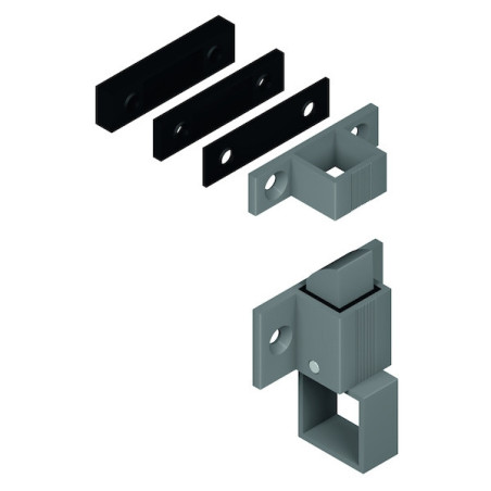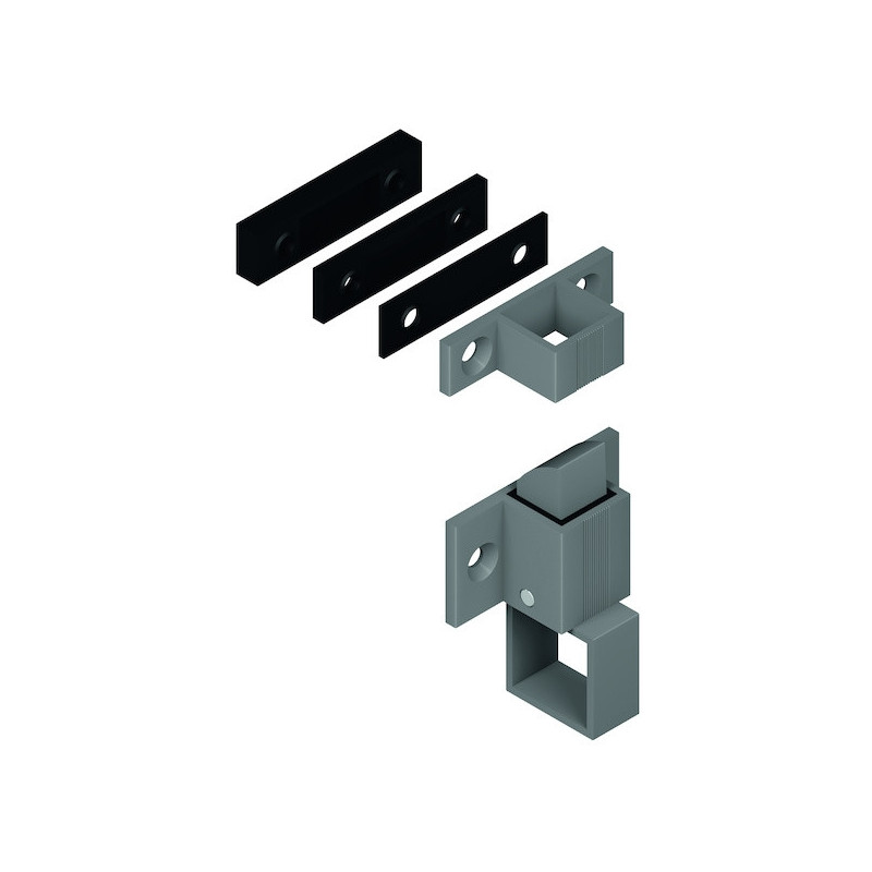 Loqueteau avec tirette étroite. Gâche + jeu de cales plastique noir. épaisseurs 1.5 - 3 et 6 mm.