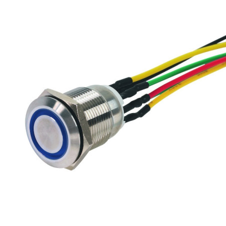 Bouton poussoir inox NO+NC à signalisation lumineuse. pouvoir de coupure de 250V AC / 2A ou 24V DC / 1A. LED couleur bleue fonctionnant seulement en 12V DC. diamètre 19mm. antivandale. -20°+55°C. IP65.Garantie 1 an