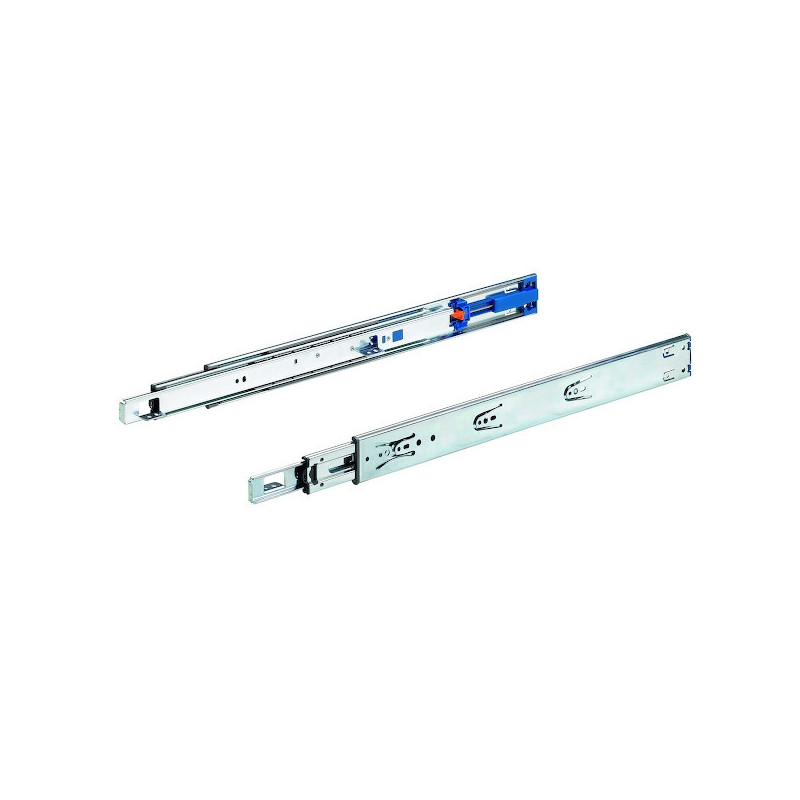 Silent System - l'amortisseur intégré ferme le tiroir en douceur et en silence À l'aide du levier de déverrouillage. le tiroir peut être séparé de la coulisse et ainsi retiré sans problème et remise en place. Coulissage aisé et grande stabilité latérale grâce au guidage exact Pour variantes de panneaux de fond rainurés. feuillurés ou à fleur Capacité de charge selon EN 15338. niveau 2 Acier zingué. bleu chromaté